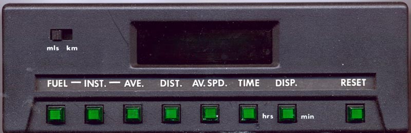 RESET-then-DISP: Hold these switches to set the minutes on the clock. RESET-then-TIME: Hold these switches to set the hours on the clock. DISP: Press this switch to blank out the display while the computer is on. TIME: Press this switch to see the total time on since last reset; it then switches to showing the time of day. AV.SPD.: Press this switch to display the average speed (in the current units) since the computer was last reset. DIST.: Press this switch to display total distance traveled (in the current units) since the last reset. AVE.: Press this switch to display the average mileage (in the current units) since the last reset. INST.: Press this switch to display the instantaneous mileage (in the current units) over the last few seconds. FUEL: Press this switch to display the total fuel consumed (in the current units) since the last reset. mls/km: Slide this switch to select gallons/miles or litres/kilometres for the displayed statistics. NOTES: -- mls/km switch will cause the display to update after a couple of seconds. Both styles of units are always being tracked, and the switch can be moved at any time. -- Gallons are US Gallons or Imperial Gallons, depending on the part number of the trip computer, which varied according to the country it was sold in. But this can be changed in the field if necessary, see below. -- Mileage is reported as "miles per gallon" or "litres per 100 km" depending on the mls/km switch. Note the opposite sense of those statistics, but they are the norm for the regions they are used in. |